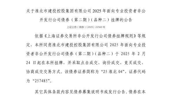 2月21日,上交所发布关于淮北市建投控股集团有限公司2025年面向专业投资者非公开发行公司债券(第二期)(品种二)挂牌的公告。